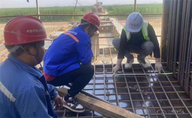 滨州乐安黄河公路大桥及接线工程主桥19#墩 0#块钢筋绑扎现场,监理人员正巡视检查预应力管道锚垫板位置、钢筋绑扎位置。监理人员积极响应“大干300天,奉献在乐安” 劳动竞赛暨党建共建活动号召,秉持“严格监理、优质服务,科学公正、廉洁自律”工作理念,坚守安全、质量、廉政底线,不断提升精细化管理水平,为项目建设保驾护航。