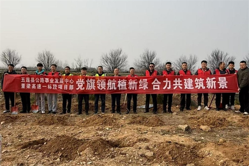 3月12日,正值植树节,董梁高速一标段项目部联合五莲县公路事业发展中心,在叩官镇G342国道旁开展“党旗领航植新绿 合力共建筑新景”植树活动。
